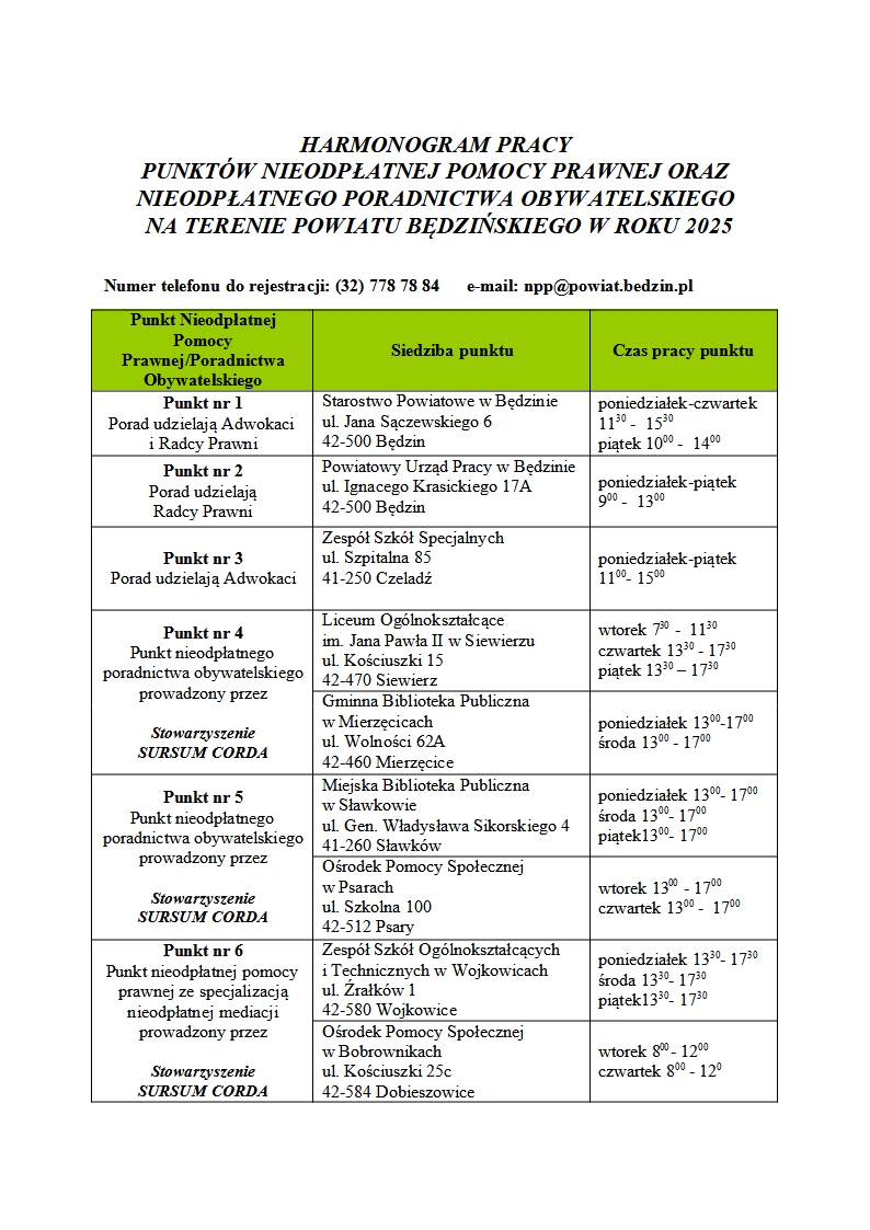 W związku z obowiązkiem wynikającym z art. 8a ust. 4 ustawy z dnia 5 sierpnia 2015 r. o nieodpłatnej pomocy prawnej, nieodpłatnym poradnictwie obywatelskim oraz edukacji prawnej, w związku ze zmianą lokalizacji punktu w Czeladzi, poniżej zamieszczono plik do pobrania, dotyczący działania punktów NPP (harmonogram).